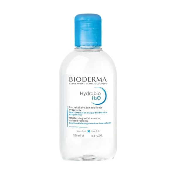 Micelarny płyn oczyszczający Bioderma HYDRABIO H2O w pojemności 250 ml, stworzony dla skóry wrażliwej i odwodnionej wymagającej delikatnego oczyszczania z jednoczesnym nawilżeniem. Patent AQUAGENIUM™ stymuluje produkcję akwaporyn, przywracając naturalną zdolność nawilżania skóry, a micele delikatnie usuwają makijaż i zanieczyszczenia. Po każdym oczyszczeniu skóra jest nawilżona i komfortowa.