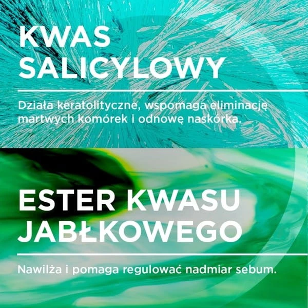 Kwas salicylowy BHA rozpuszcza tłuszczowe zatory w porach od wewnątrz, podczas gdy kwas jabłkowy AHA złuszcza naskórek od powierzchni. Co to znaczy dla Ciebie: pory są oczyszczane jednocześnie od wewnątrz i od zewnątrz, co radykalnie ogranicza powstawanie nowych zaskórników i krostek.