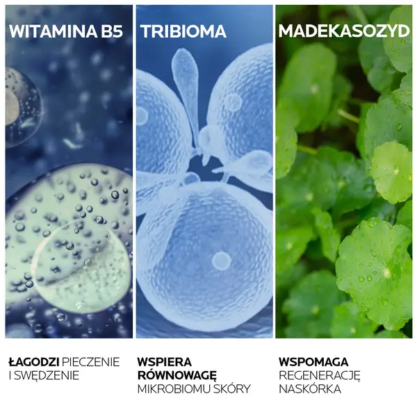 - Tribioma (kompleks prebiotyczny) - przywraca równowagę mikrobiomu skóry, wspomaga regenerację.
