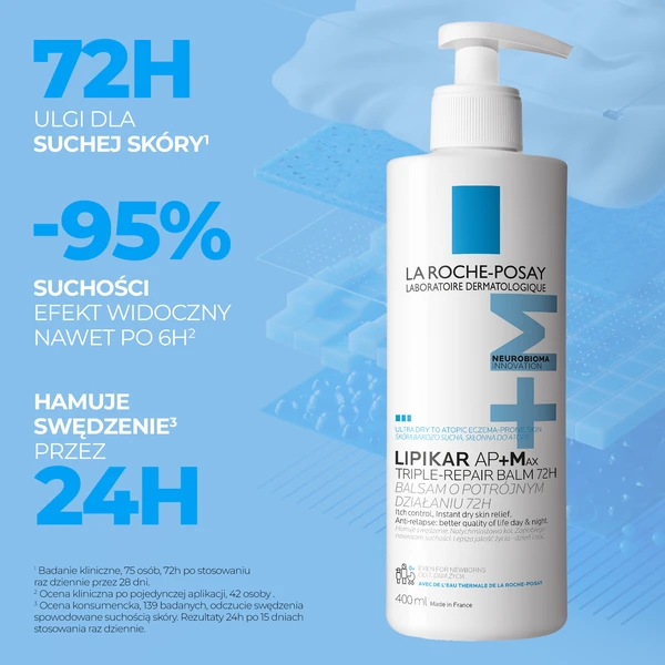 Atopowe zapalenie skóry wymaga codziennego, intensywnego emolientu stosowanego na całe ciało, więc rozmiar 400 ml to minimum dla skutecznej kuracji. La Roche-Posay Lipikar Baume AP+MAX z Tribioma, masłem shea i niacynamidem to silnie regenerujący balsam łagodzący świąd, wzmacniający barierę i przywracający równowagę mikrobiomową skóry atopowej. Opracowany z dermatologami specjalizującymi się w AZS.