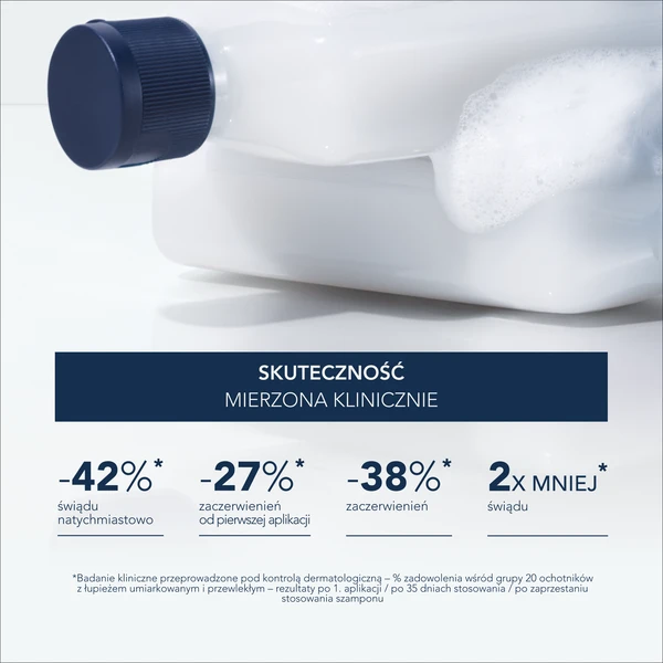 - Nanieś niewielką ilość szamponu na mokre włosy. Delikatnie wmasuj w skórę głowy i włosy, aż do uzyskania piany. Pozostaw na 2 minuty, a następnie dokładnie spłucz letnią wodą. W razie potrzeby powtórz czynność