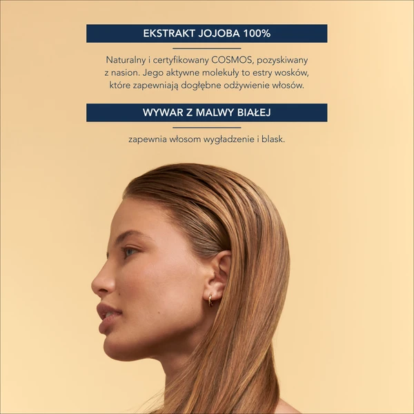 - Po umyciu włosów szamponem, delikatnie odciśnij nadmiar wody. Nanieś obfitą ilość maski na długości i końcówki włosów. Pozostaw na 5-7 minut, a następnie dokładnie spłucz letnią wodą