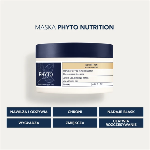 Phyto Nutrition odżywcza maska 200 ml to intensywna kuracja dla włosów suchych i zniszczonych. Bogata formuła z masłem shea, olejem jojoba, olejem słonecznikowym i woskiem jojoba otacza każde pasmo, odbudowując je i nadając wyjątkową miękkość. Stosuj 1-2 razy w tygodniu na całej długości włosów.
