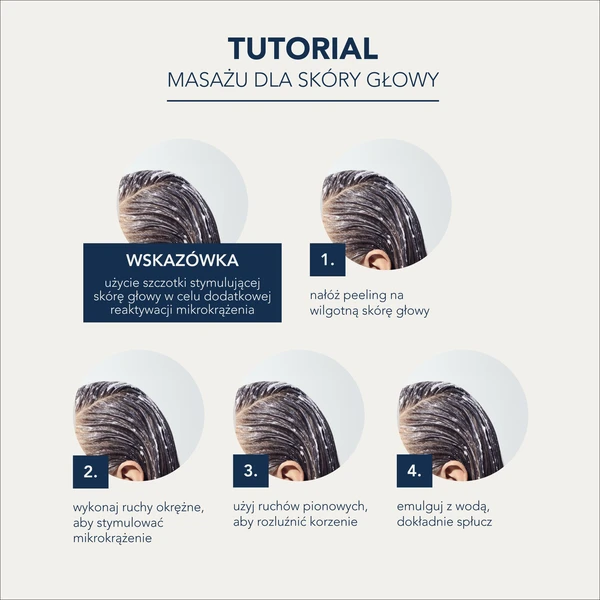- Nałóż niewielką ilość peelingu na mokrą skórę głowy, sekcja po sekcji.