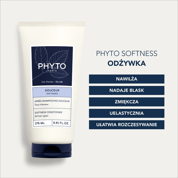 Phyto Softness odżywka 175 ml to codzienna odżywka nawilżająca dla wrażliwej skóry głowy i wszystkich typów włosów. Formuła z olejem rycynowym, jojoba, olejem migdałowym i ekstraktem z owsa odżywia i wygładza włosy, nadając im miękkość i połysk. Panthenol wzmacnia strukturę włosa. Stosuj po każdym myciu włosów.
