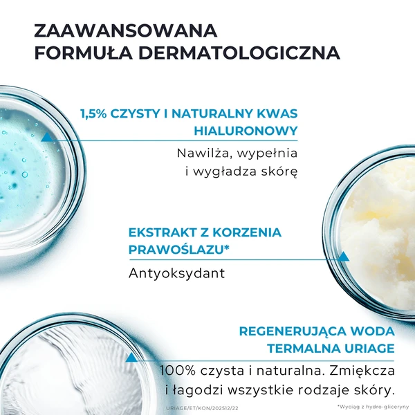 Woda Termalna Uriage dostarcza skórze unikalnych korzyści – koi, nawilża, wzmacnia barierę skórną, co przekłada się na widoczną poprawę kondycji naskórka. Kwas hialuronowy (różne masy cząsteczkowe) dostarcza skórze unikalnych korzyści – intensywnie nawilża, wypełnia drobne zmarszczki, poprawia elastyczność, co przekłada się na widoczną poprawę kondycji naskórka. Aquaxyl dostarcza skórze unikalnych korzyści – optymalizuje rezerwy wody w skórze, wzmacnia barierę skórną, co przekłada się na widoczną poprawę kondycji naskórka.