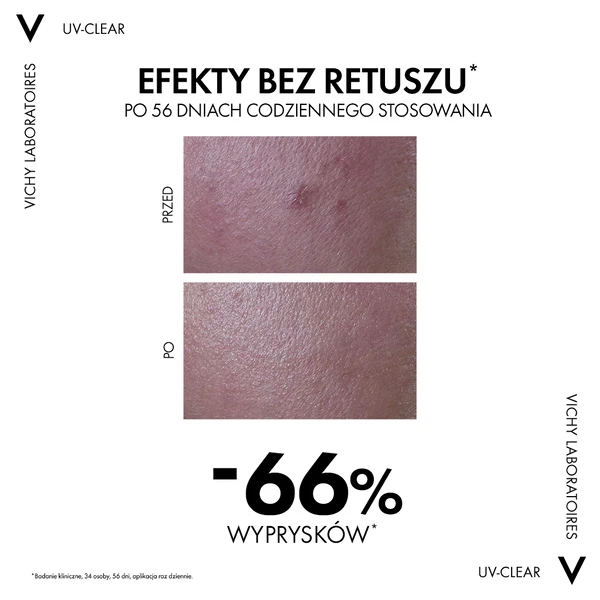 Vichy Capital Soleil UV-Clear SPF50+ to rewolucyjny fluid ochronny dla skóry trądzikowej i skłonnej do niedoskonałości. Niacynamid redukuje przebarwienia potrądzikowe, kwas salicylowy oczyszcza pory, a filtry SPF50+ chronią przed fotostarzeniem. Matujący, niekomedogenny fluid jest idealną ochroną dla cery tłustej i trądzikowej. Klinicznie testowany
